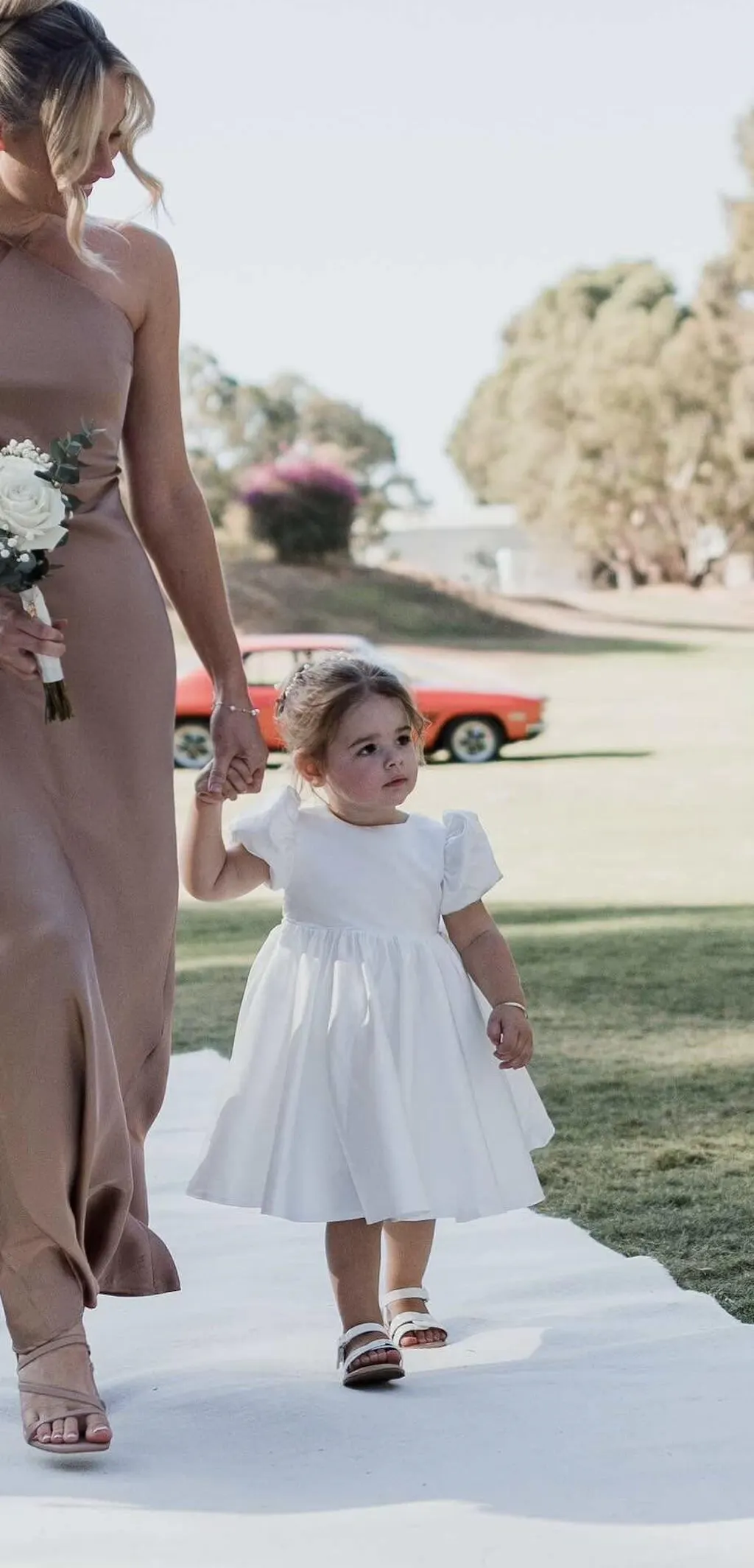 A classic beauty with modern style. Crafted in satin, our new Frankie dress is perfection for your flower girls. Similar to our Cleo dress but with a round neckline, along with a knee length skirt and built in petticoat to add fullness, sweet satin puff sleeves, and to finish, a statement bow sash which can be tied at the back or the front.