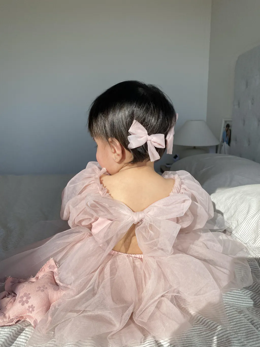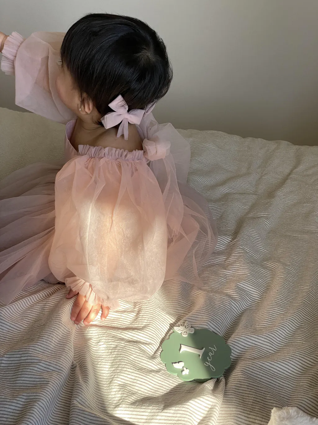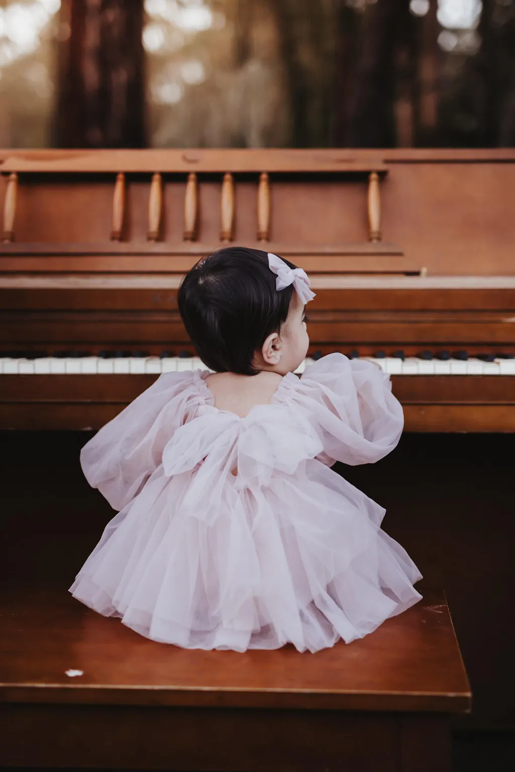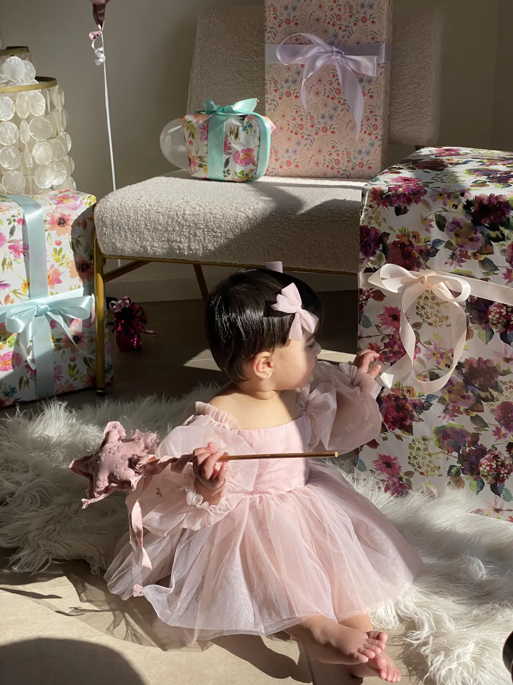 With full length soft tulle sleeves and our signature tulle bow back, our new Wren romper in dusty pink is a beautiful choice for your flower girls and birthday babes.